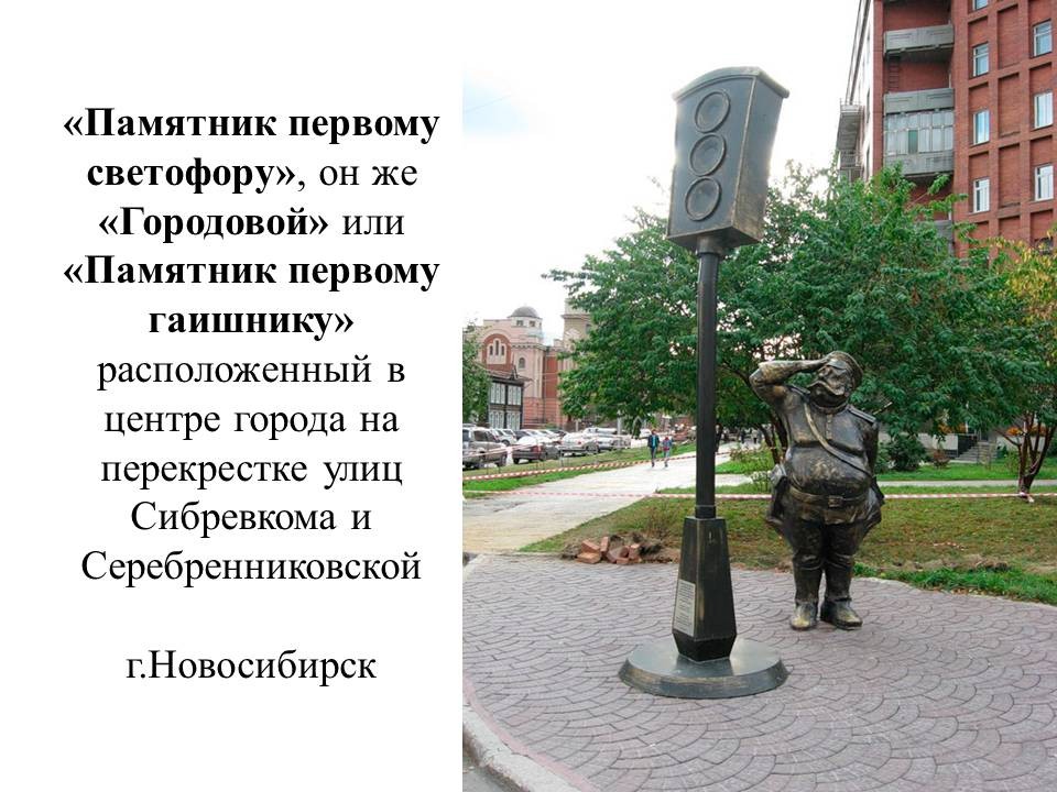 | Следующий памятник тоже связан с дорогами. Это “Памятник первому светофору”, он же “Городовой” или “Памятник первому гаишнику” расположенный в центре города на перекрестке улиц Сибревкома и Серебренниковской, г.Новосибирск. | Слайд 5 | |