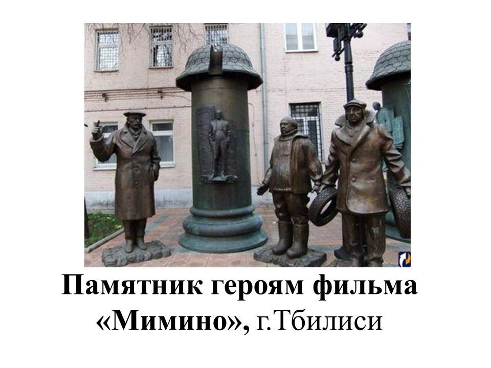 | В 2007 году в Москве была установлена бронзовая скульптурная композиция героев кинокомедии “Мимино” возле Московского музея современно искусства (улица Петровка д.25). Все скульптуры из композиции сделаны скульптором Зурабом Церетели. Так он решил выказать дань уважения фильму на его 30-летие. Скульптурная композиция представляет собой три скульптуры главных героев кинокомедии: Валико (Вахтанг Кикабидзе), Рубику (Фрунзик Мкртчян), Иван (Евгений Леонов). | Слайд 7 | |