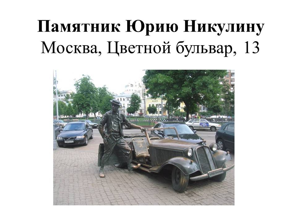 | Памятник Юрию Никулину был открыт 3 сентября 2000 г. перед зданием цирка, в котором актёр и клоун проработал более полувека. Памятник представляет собой бронзовую фигуру Никулина, выходящего из припаркованного кабриолета, который известен по фильму “Кавказская пленница”. Никулин одет в свой клоунский пиджачок с галстуком и шляпу-канотье. Кабриолет был сделан с чуть меньшими размерами, чем оригинал. Вместо номеров на автомобиле закреплена табличка с надписью “Юрий Никулин”. Для работы использовались фотографии кабриолета, ныне находящегося в частной коллекции. Автором памятника выступил скульптор Александр Рукавишников. Памятник создавался в течение двух лет. Кабриолет был отлит в Минске, а более сложную фигуру актёра пришлось отливать в Италии. Всего вес скульптурной композиции составляет 3,5 тонны. Изготовление памятника обошлось в 350 тыс. долларов США. | Слайд 8 | |