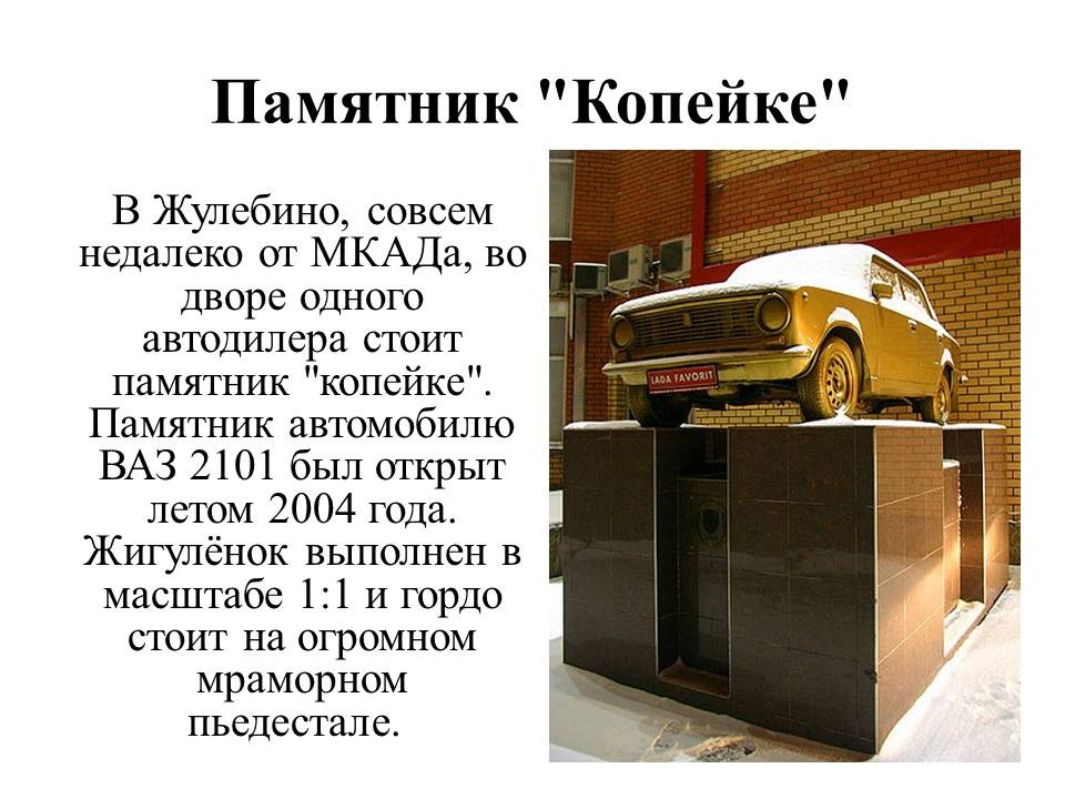 | Незаурядная идея, которая воплотилась в уникальный монумент, украшает столицу с недавнего времени. Памятник посвящен первому автомобилю Волжского завода – народной легендарной "копейке". Народной неспроста: эта машина с 1970 года колесит по просторам России. Она претерпела множество изменений советского "тюнинга", но при этом имела не дюжий спрос. Машина выдержала ужасные российские дороги. По сей день авто можно встретить в каком-нибудь дворе. И уж точно без "копейки" не обойдется ни одна русская глубинка. Настоящий автомобиль прошлого величественно возвышается на постаменте из мрамора. Он покрыт специальной бронзовой краской, для лучшей сохранности и более презентабельного вида. Памятник ВАЗу 2101 заметен каждому издалека, кто проезжает по Волгоградскому проспекту. Во время открытия памятника всем присутствующим показали фильм "Копейка", 2002 год. В ленте красочно описали судьбу данной модели и факты, о которых никто не знал раньше. | Слайд 9 | |