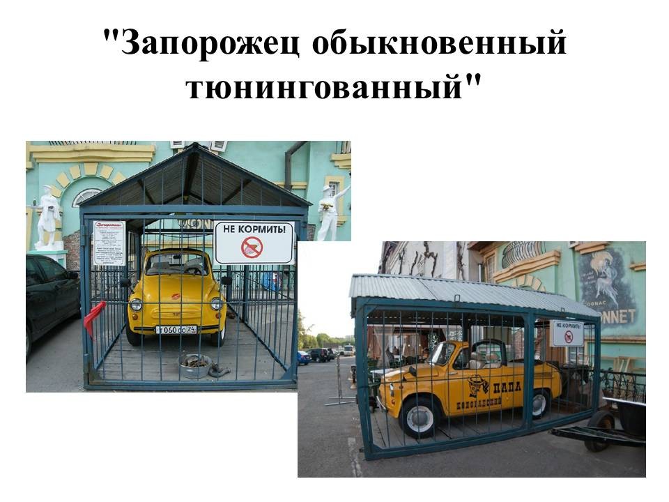 | "Запорожец обыкновенный тюнингованный", – гласит табличка на клетке. Вот такого "зверя" приютил ночной клуб "Колорадский папа". Выглядит он очень ухоженным, и, судя по содержимому миски, соблюдает строгую диету. Памятник расположен на пр. имени газеты "Красноярский рабочий", д. 160е. | Слайд 10 | |