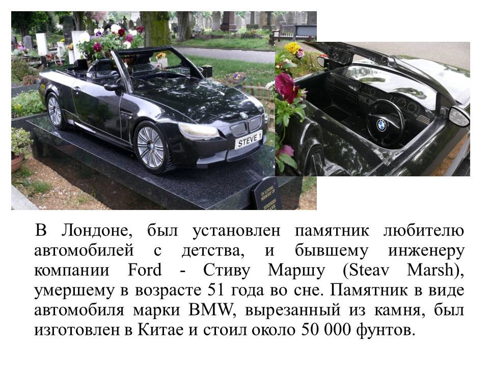 | В Лондоне, был установлен памятник любителю автомобилей с детства, и бывшему инженеру компании Ford – Стиву Маршу (Steav Marsh), умершему в возрасте 51 года во сне. Памятник в виде автомобиля марки BMW, вырезанный из камня, был изготовлен в Китае и стоил около 50 000 фунтов. | Слайд 12 | |