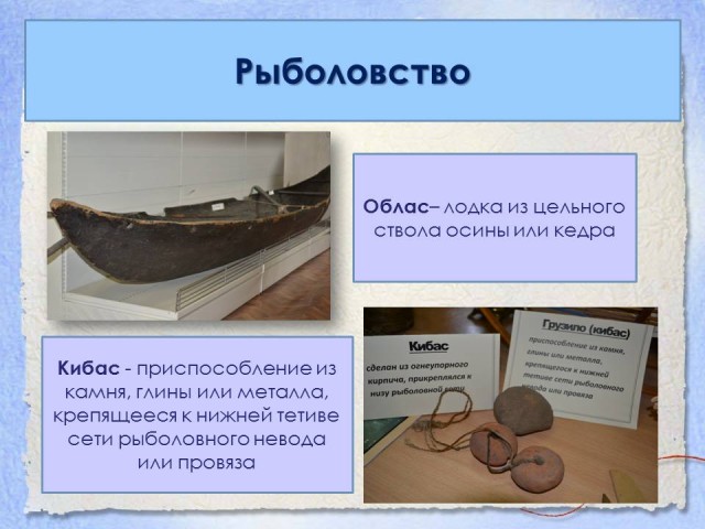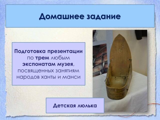 Подготовка презентации по трем любым экспонатам музея, посвященных занятиям народов ханты и манси.