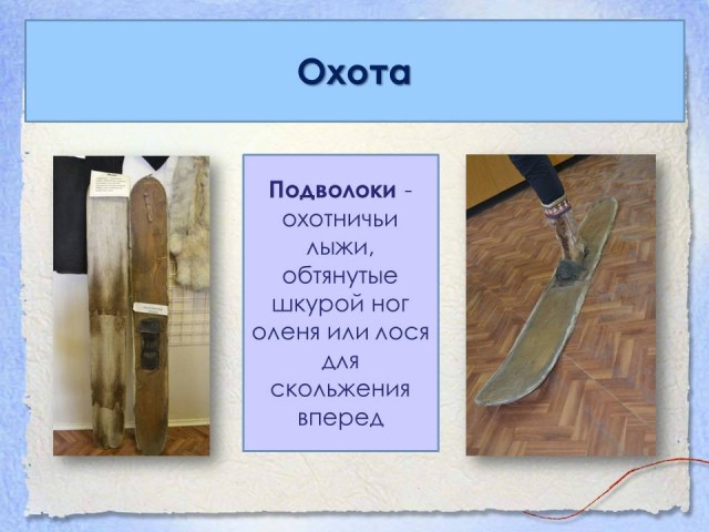 Подволоки – охотничьи лыжи, обтянутые шкурой ног оленя или лося для скольжения назад (неверно).