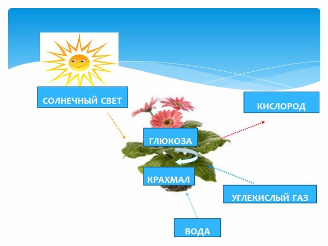 Прочитав текст, смоделировать процесс фотосинтеза. У вас на партах есть рисунок и карточки со словами, вам нужно распределить карточки со словами по рисунку возле соответствующих стрелочек. На карточках слова: углекислый газ, вода, глюкоза, крахмал, солнечный свет (пропущено слово КИСЛОРОД).
