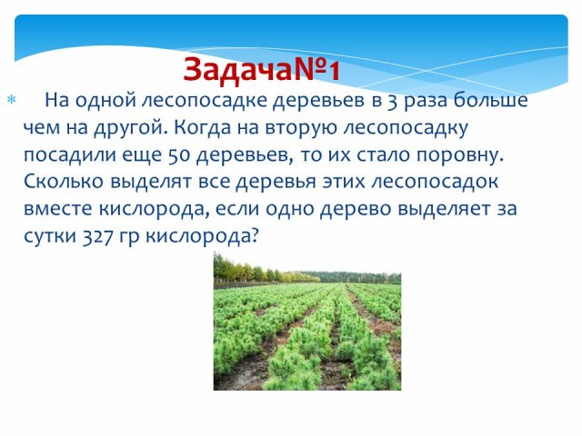 На одной лесопосадке деревьев в 3 раза больше чем на другой. Когда на вторую лесопосадку посадили еще 50 деревьев, то их стало поровну. Сколько выделят все деревья этих лесопосадок вместе кислорода, если одно дерево выделяет за сутки 327 гр кислорода?