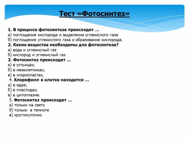 2). Тест “Фотосинтез” (каждый учащийся выполняет задания индивидуально) Приложение 2.