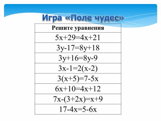 Игра “Поле чудес”. Решите уравнения и получите букву для ключевого слова. Приложение 3.