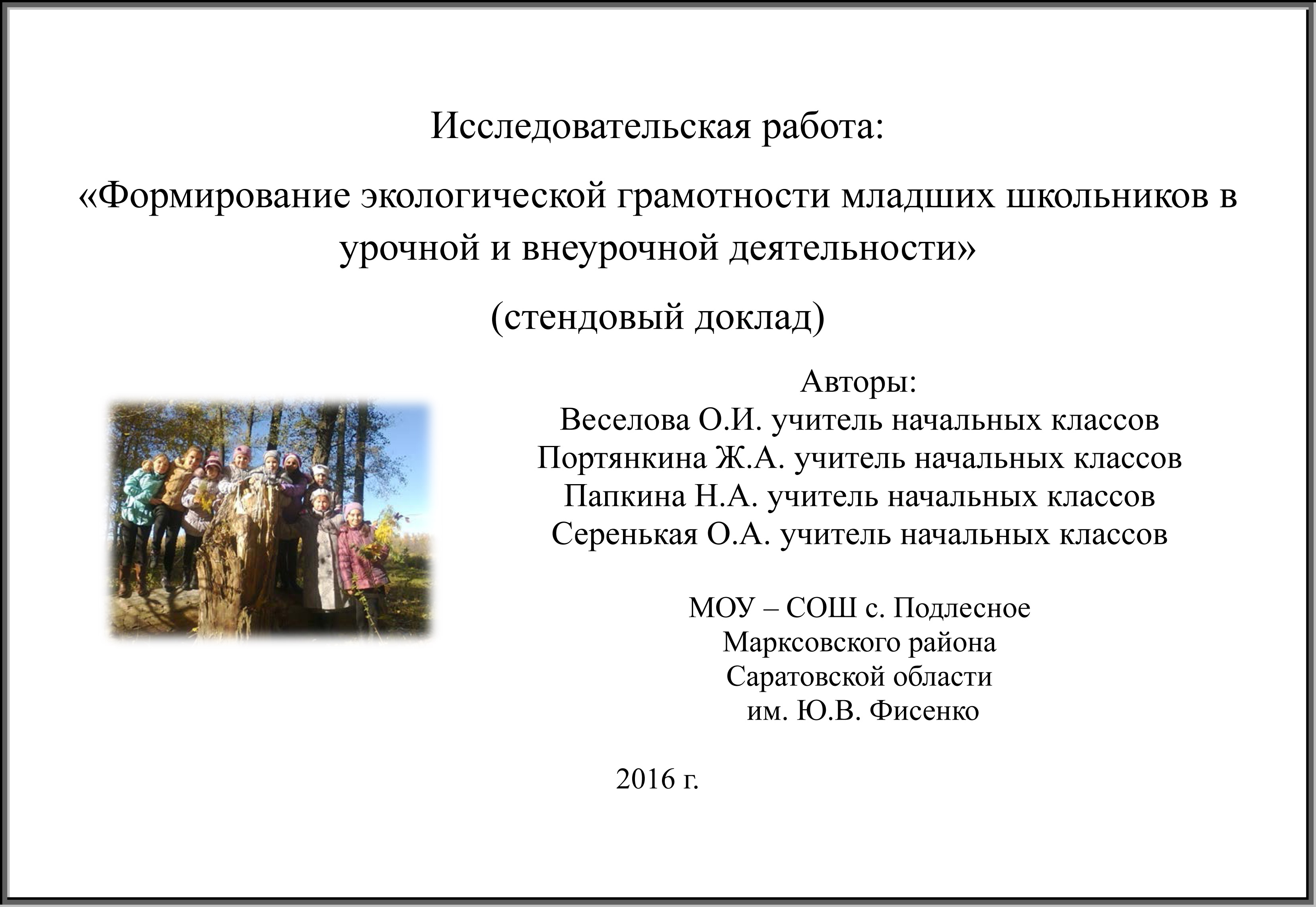 Обучающиеся начальных классов МОУ – СОШ с.Подлесное состояли в Саратовском отделении всероссийского общества “Охраны природы”. На протяжении ряда лет принимали участие во всероссийских конкурсах-играх “ЧиП”, “Гелиантус”, олимпиадах разного уровня по естествознанию.