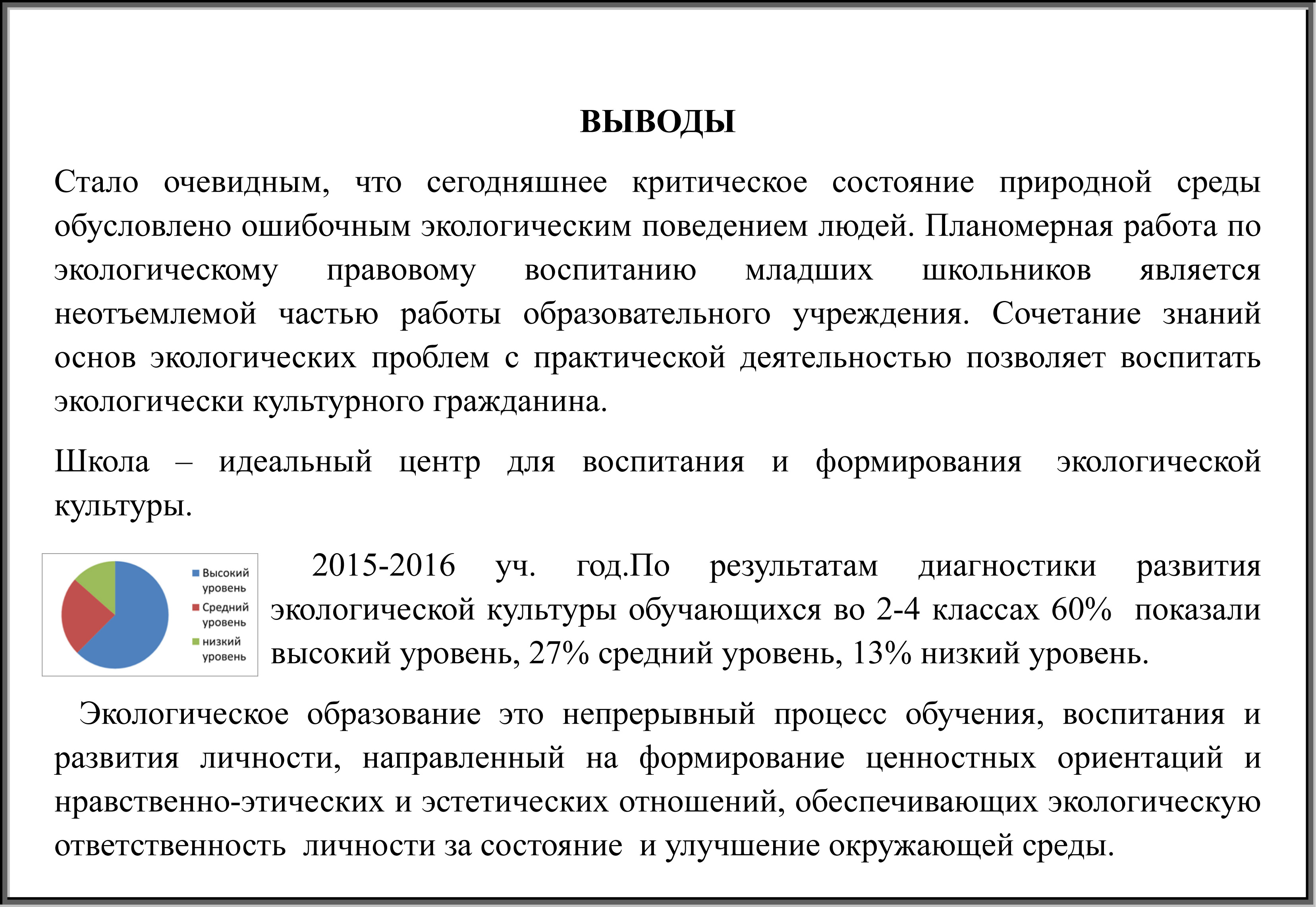 2015-2016 уч. год. По результатам диагностики развития экологической культуры обучающихся во 2-4 классах 60% показали высокий уровень, 27% средний уровень, 13% низкий уровень.