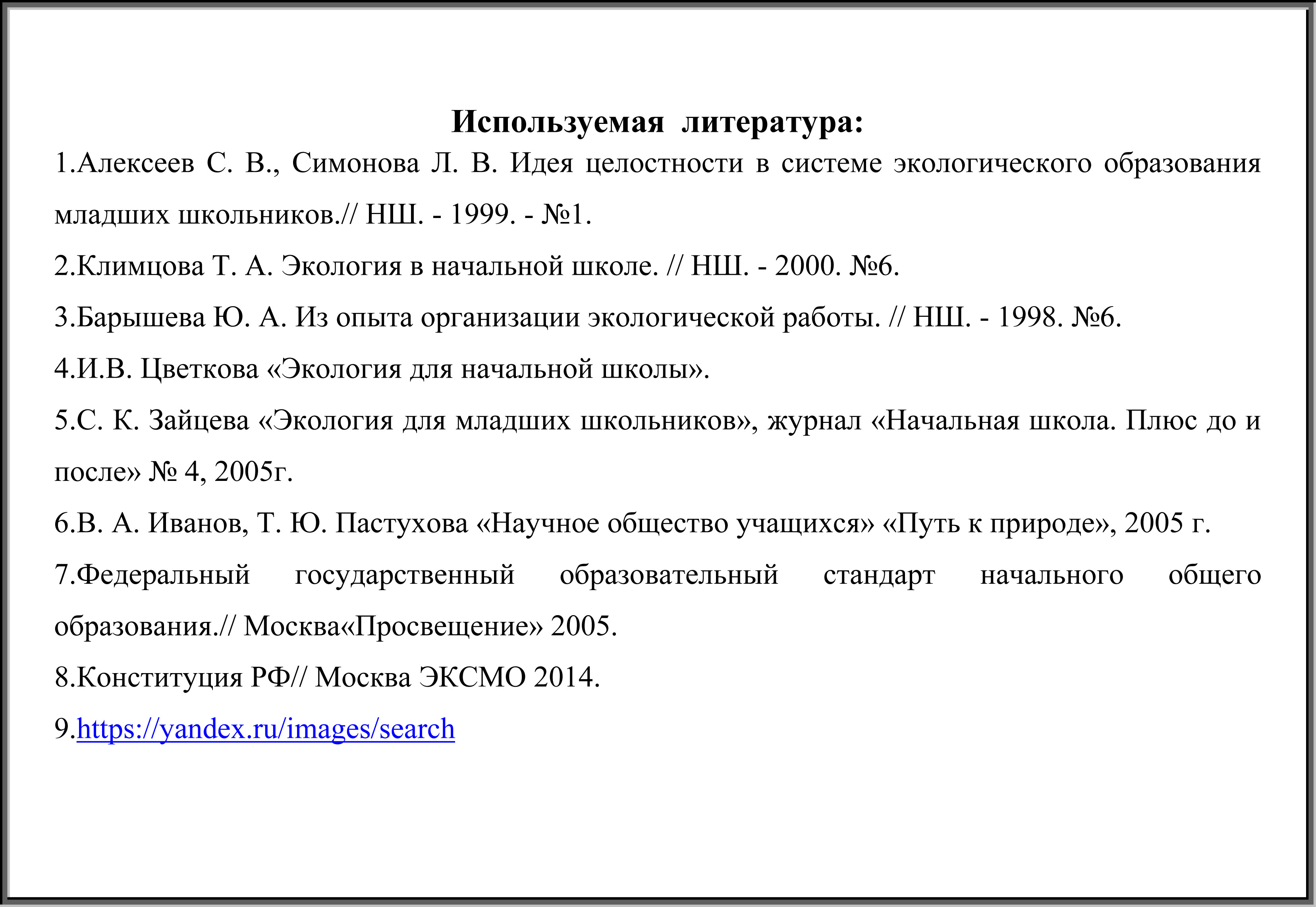 1. Алексеев С. В., Симонова Л. В. Идея целостности в системе экологического образования младших школьников.// НШ. - 1999. - №1.
