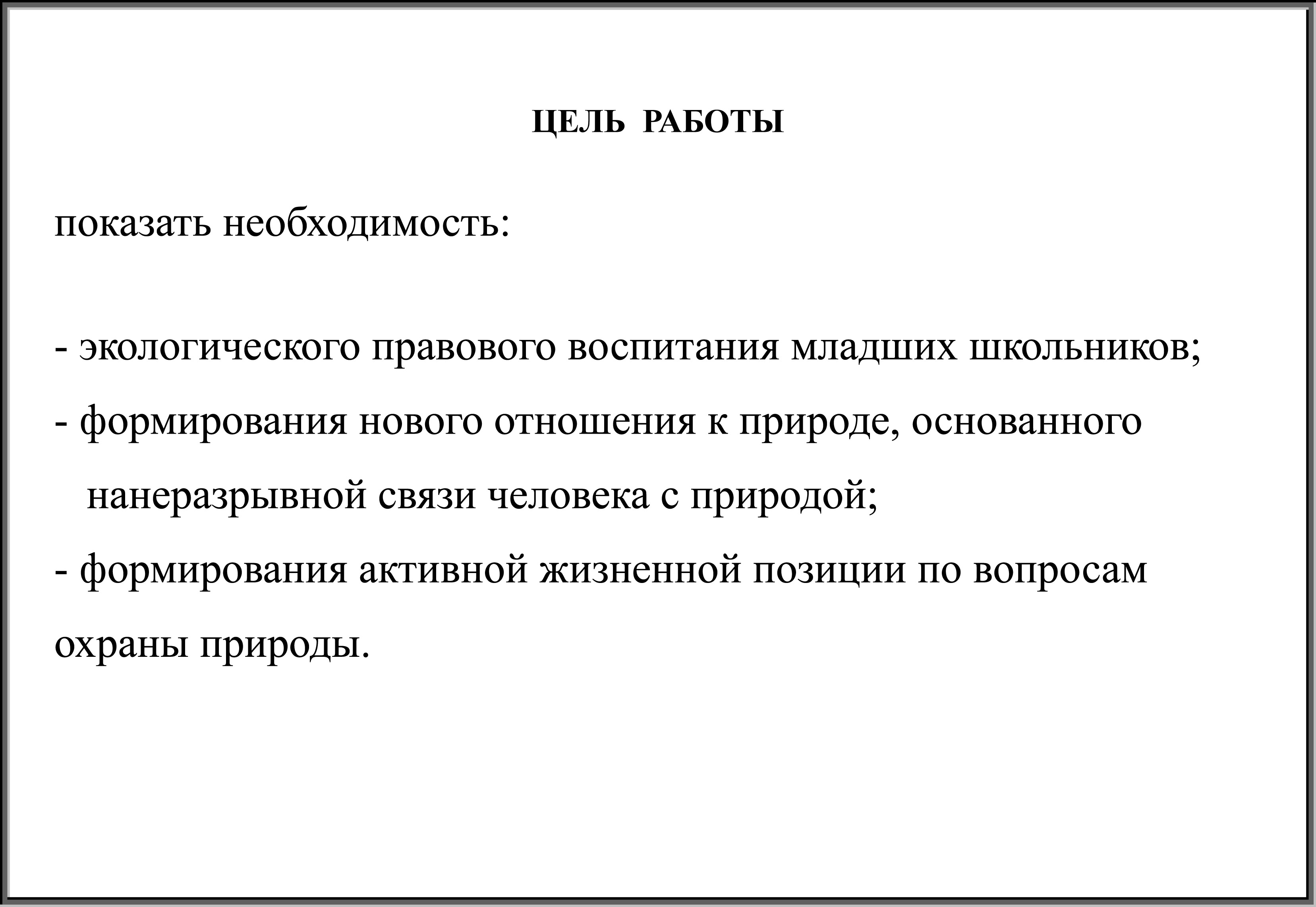 - формирования нового отношения к природе, основанного на неразрывной связи человека с природой;