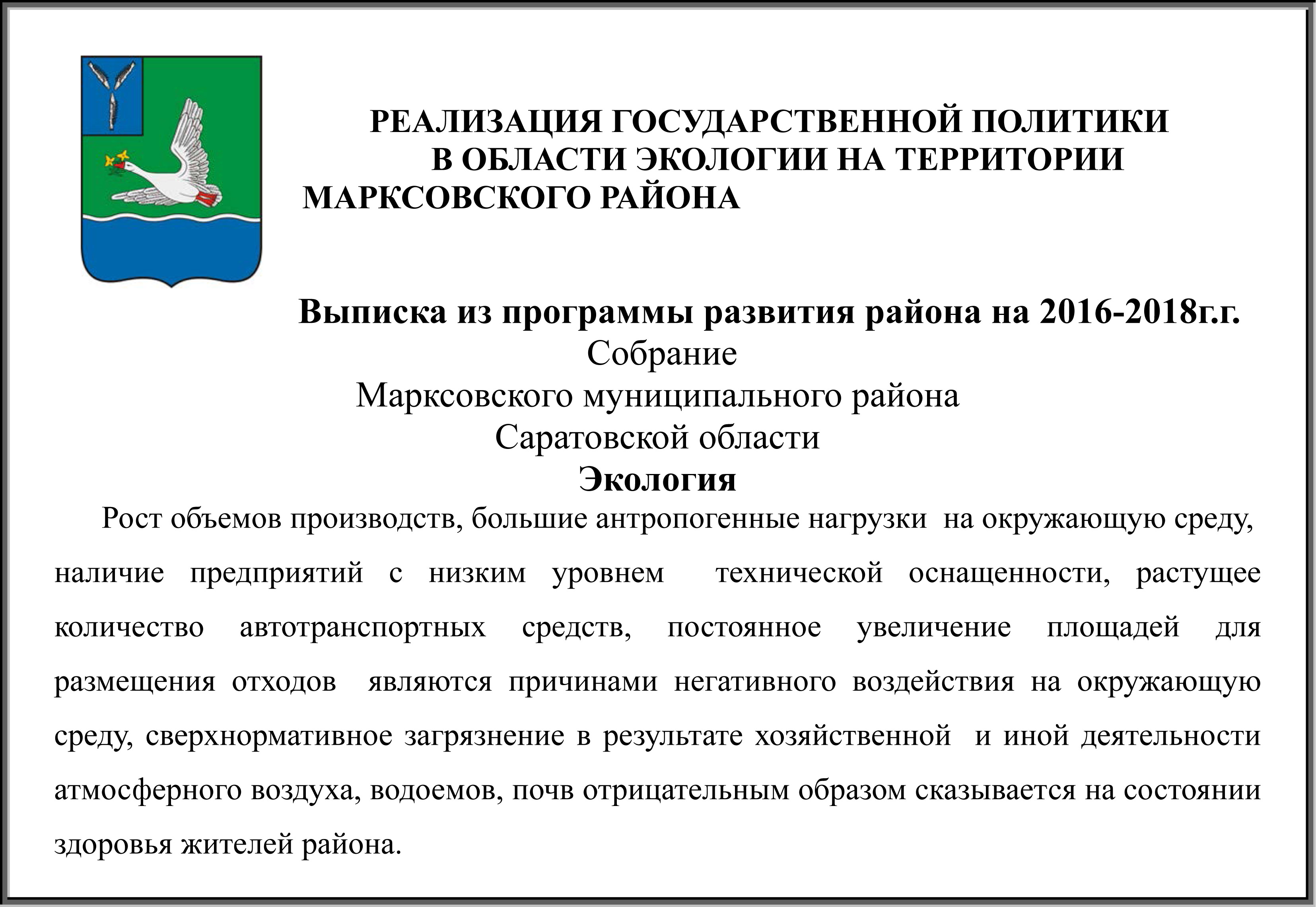 РЕАЛИЗАЦИЯ ГОСУДАРСТВЕННОЙ ПОЛИТИКИ В ОБЛАСТИ ЭКОЛОГИИ НА ТЕРРИТОРИИ МАРКСОВСКОГО РАЙОНА