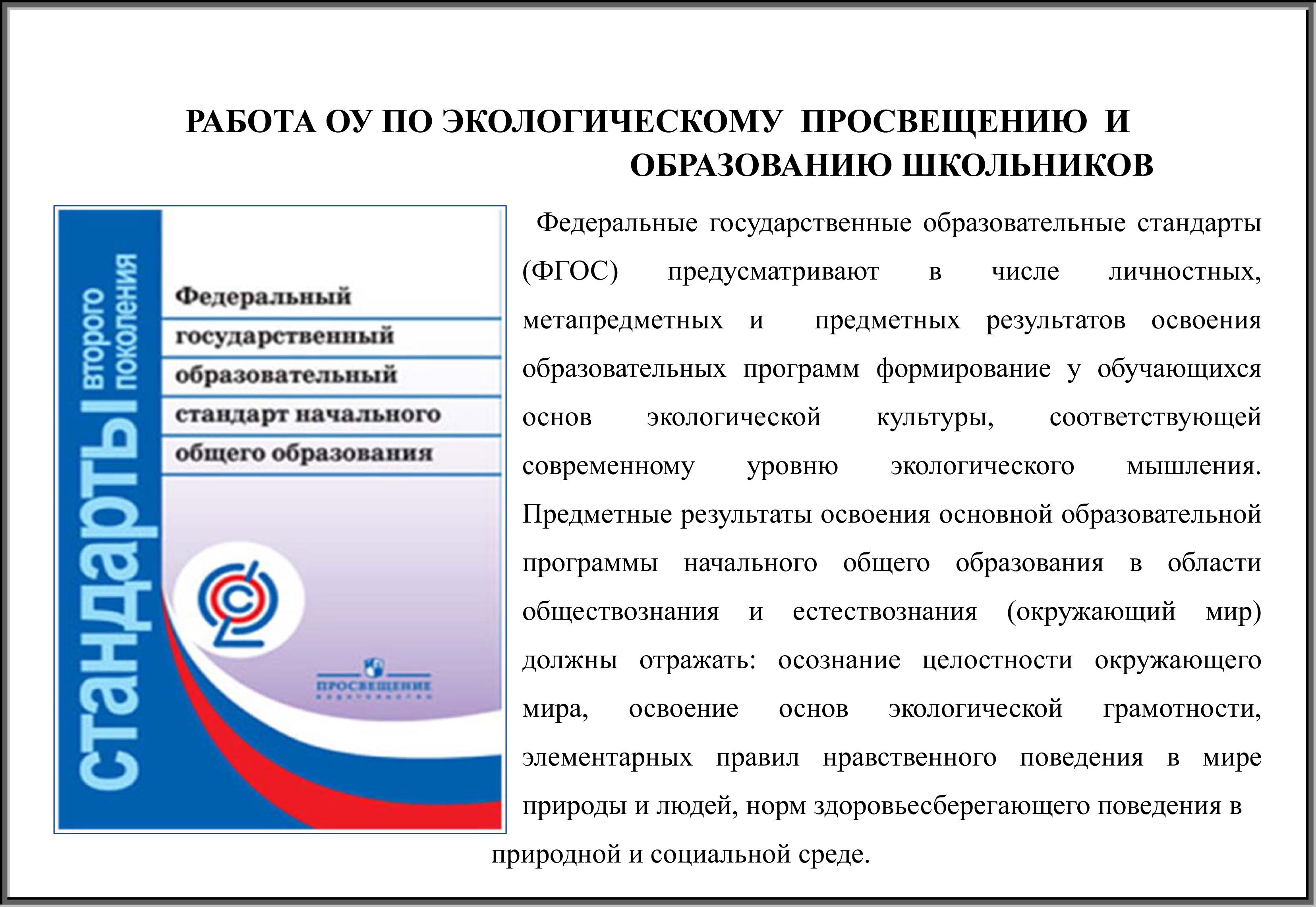 Федеральные государственные образовательные стандарты (ФГОС) предусматривают в числе личностных, метапредметных и предметных результатов освоения образовательных программ формирование у обучающихся основ экологической культуры, соответствующей современному уровню экологического мышления. Предметные результаты освоения основной образовательной программы начального общего образования в области обществознания и естествознания (окружающий мир) должны отражать: осознание целостности окружающего мира, освоение основ экологической грамотности, элементарных правил нравственного поведения в мире природы и людей, норм здоровьесберегающего поведения в природной и социальной среде.