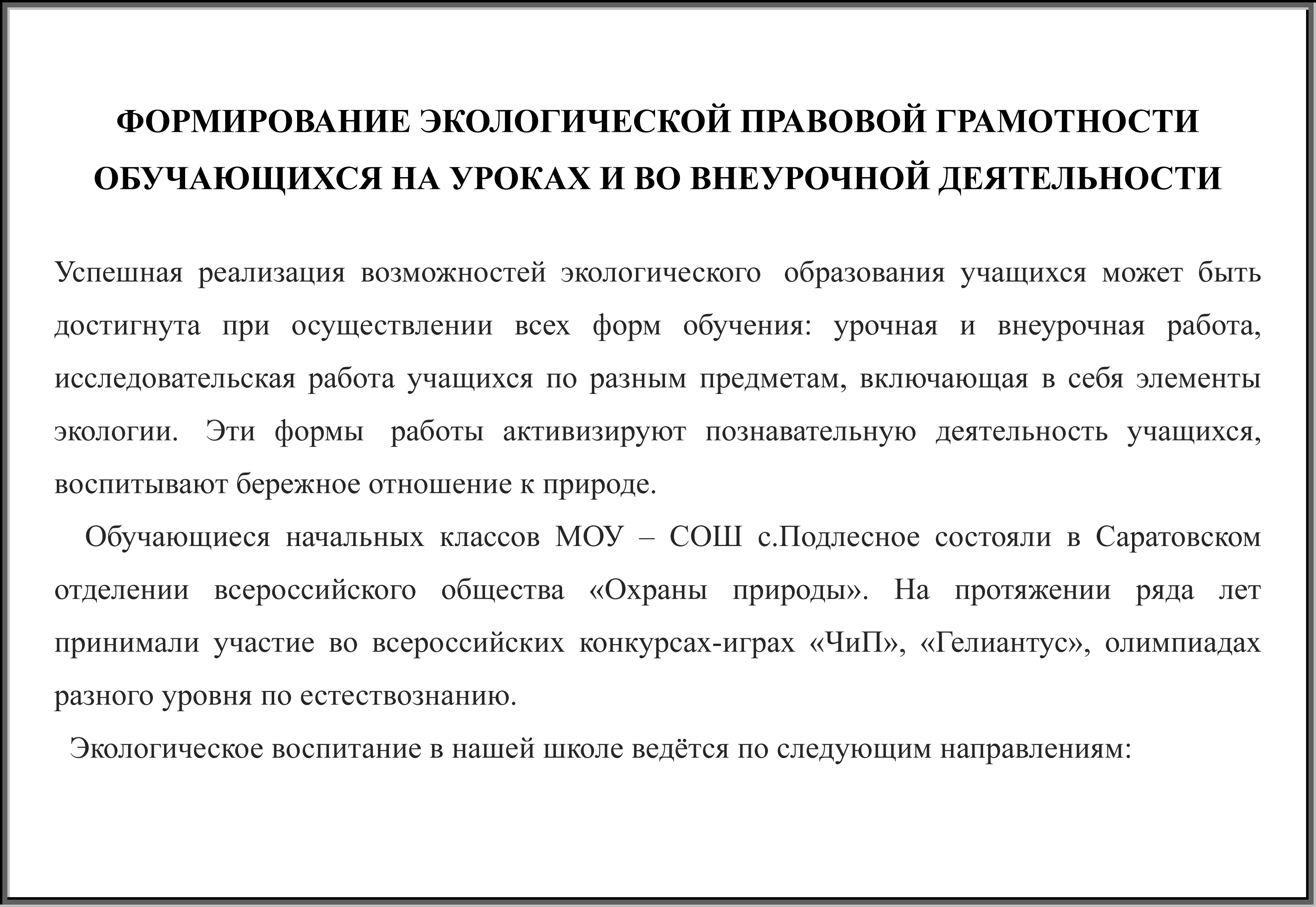 ФОРМИРОВАНИЕ ЭКОЛОГИЧЕСКОЙ ПРАВОВОЙ ГРАМОТНОСТИ ОБУЧАЮЩИХСЯ НА УРОКАХ И ВО ВНЕУРОЧНОЙ ДЕЯТЕЛЬНОСТИ
