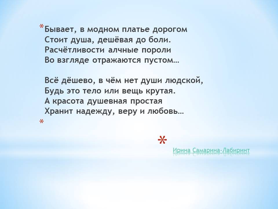 Что мы понимаем под термином «эмоционально-ценностный опыт отношения к миру»? Это язык чувств и эмоций. Но они не возникают у человека сами по себе. Они являются его реакцией на явления окружающей жизни. Смыслом этих чувств и эмоций является выражение отношения человека к различным объектам и событиям, то есть их оценка. Оценка – способность человека осознавать и формировать собственное отношение к окружающему миру и к самому себе. Передача ребенку знаний в процессе учебы, это передача опыта, накопленного человечеством, и не просто опыта, а оценки разными людьми, в разные эпохи, разных явлений на основе выработанных человеческим родом нравственно-эстетических критериев. Главным смыслом обучения является духовно-нравственное развитие ребенка, то есть формирование у него качеств, отвечающих представлениям об истинной человечности, о доброте и культурной полноценности в восприятии мира. Современная школа должна быть нацелена на создание условий для развития творческого начала, для формирования внутренне свободного человека.