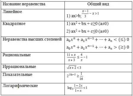 В таблице 1 представленные основные типы изучаемых неравенств.