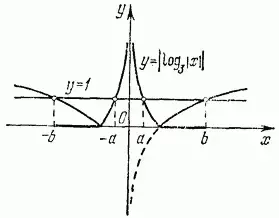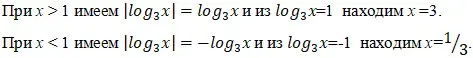 log3x показан сплошной линией. Далее проведена прямая y = 1. Сразу видно, что данному неравенству будут удовлетворять значения х из двух симметричных интервалов: