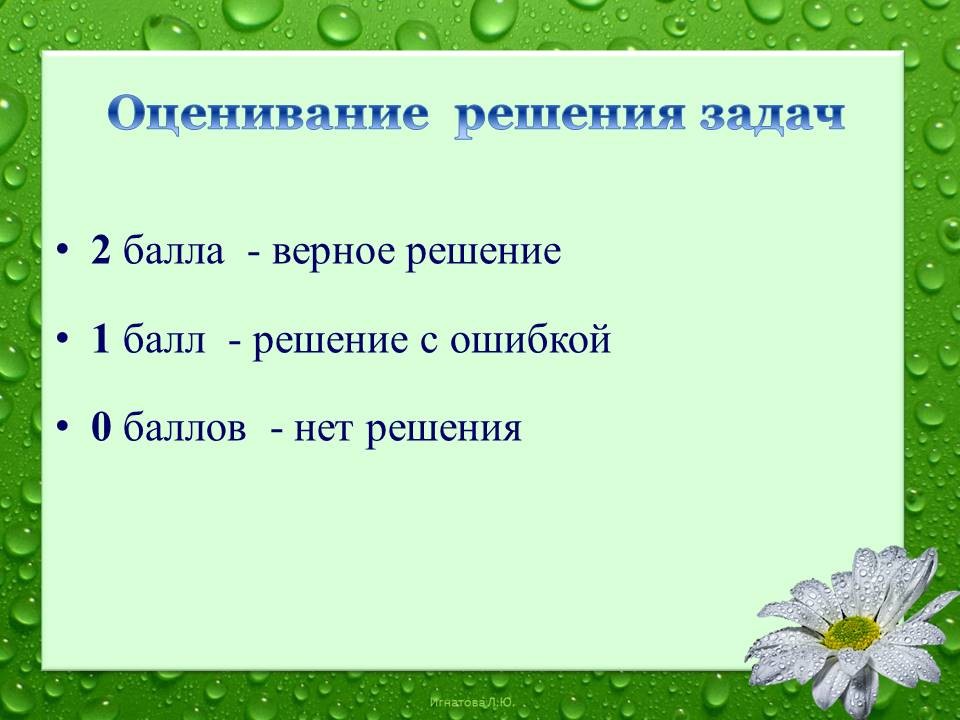- Решение каждой задачи будем оценивать так: верно решил - 2 балла, неполное решение - 1 балл, не решил – 0 баллов.