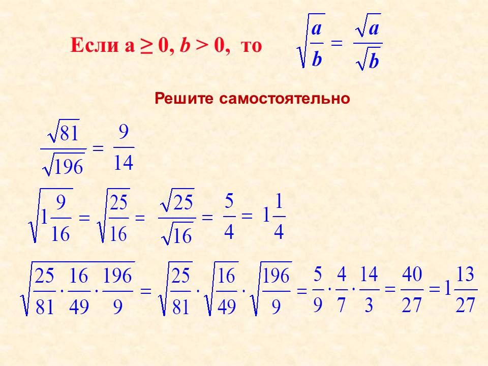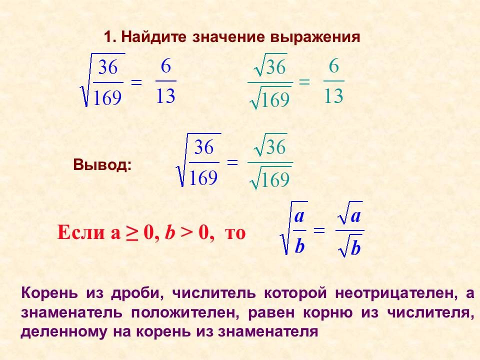 Корень из дроби, числитель которой неотрицателен, а знаменатель положителен, равен корню из числителя, деленному на корень из знаменателя.