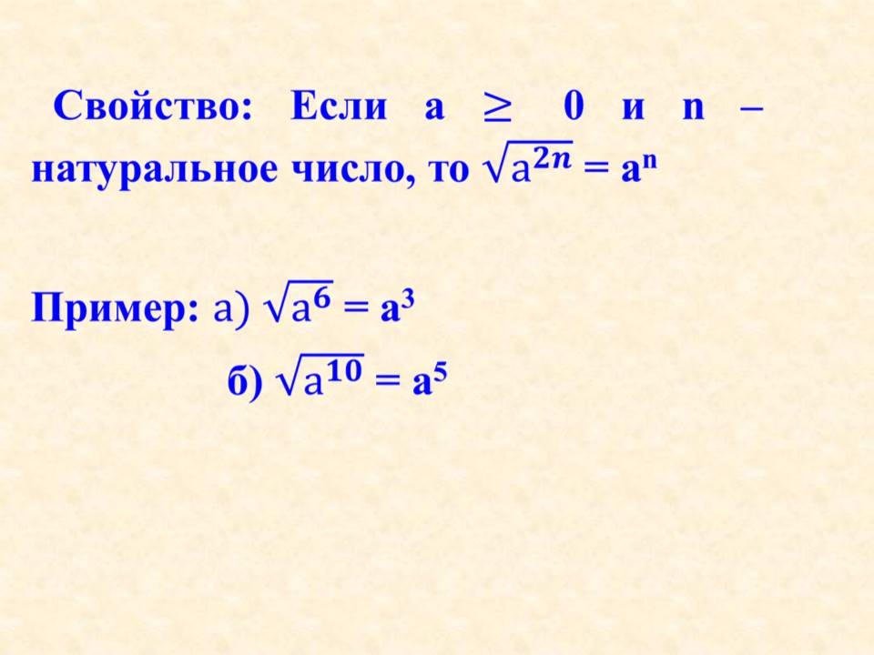 Цель урока: рассмотреть свойства о корне из произведения, о корне из дроби и корня из степени.