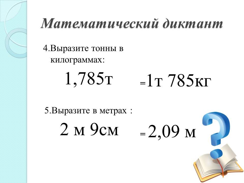 - Выразите тонны в килограммах: 1,785т