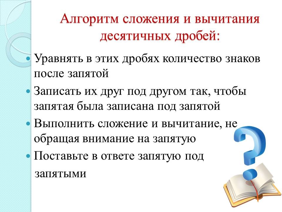 На слайде №4 выводится "Алгоритм сложения и вычитания десятичных дробей" построчно:
