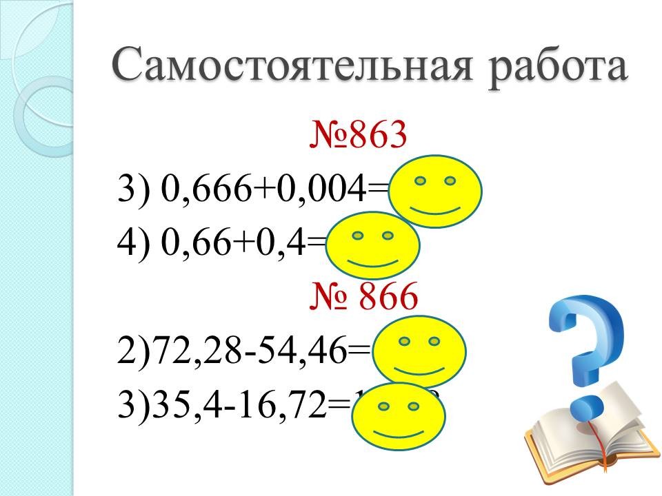 Слайд №5. В учебнике открываем №863, 866. Один из учеников решает первый пример на доске, остальные примеры решаем самостоятельно