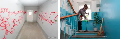 Строители сделали в нашем подъезде ремонт. Вова изрисовал маркером все стены. Соседи возмутились. А бабушка, соседка Вовы, вышла и с трудом отмыла стены.