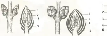 5. Зарисуйте расположение почек на стебле. Подпишите части почек на рисунках. Укажите, какая из них вегетативная, а какая - генеративная.