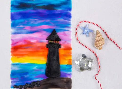 - Посмотрите, на этой картине изображен закат? Из чего выполнена эта картина? Что здесь является фоном? Да, и небо, и море нарисовано пластилином. Потрогайте, фон гладкий, цвета плавно перетекают из одного в другой, как будто, это нарисовано красками. Силуэты, каких предметов мы видим на фоне заката? Потрогайте. Маяк слеплен из пластилина. Мы его можем пощупать. Это рельефное изображение, такое изображение, которое можно потрогать, но только с одной стороны.
