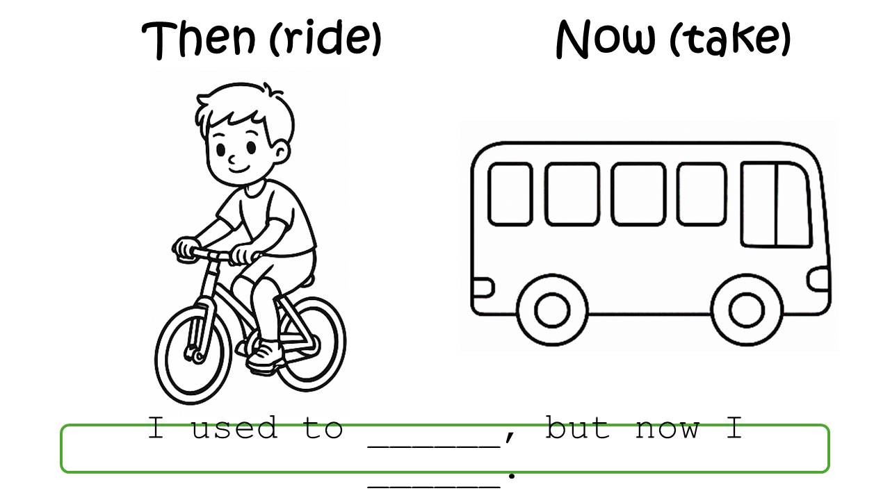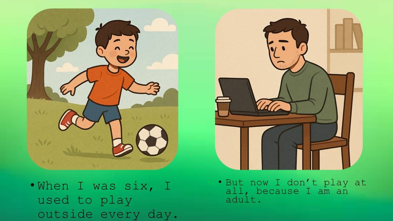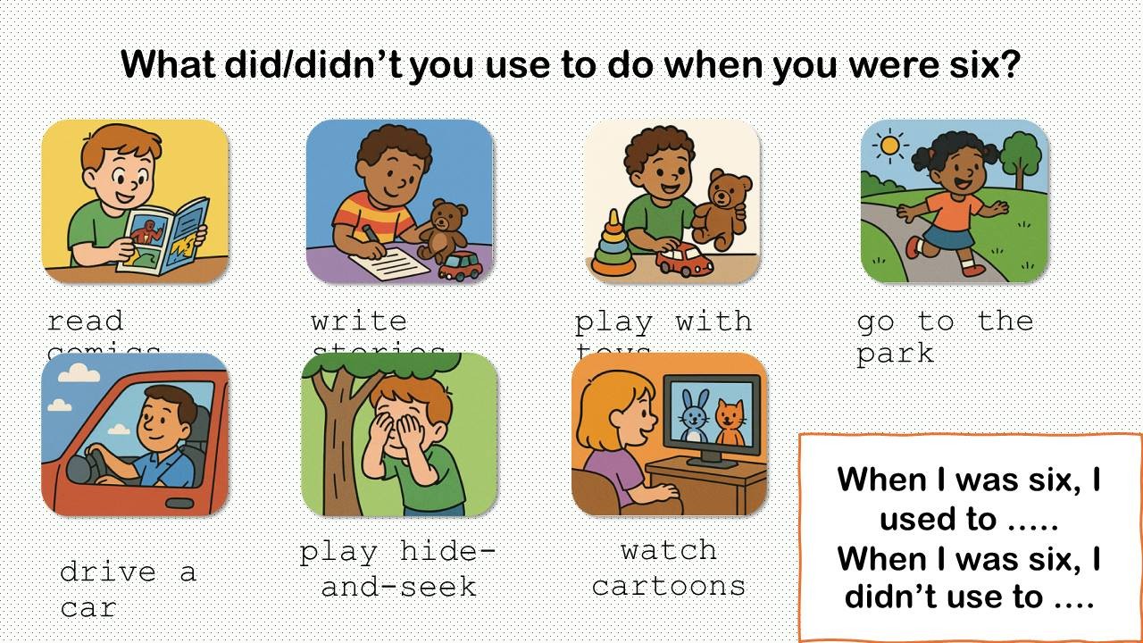 I used to watch cartoons every morning. - Используют шаблон на слайде и флэш-карточки с активностями (ride a bike, drive a car, play hide-and-seek …).