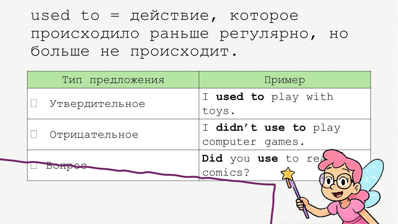 - Ученики анализируют и выдвигают гипотезу: “Что значит used to?”