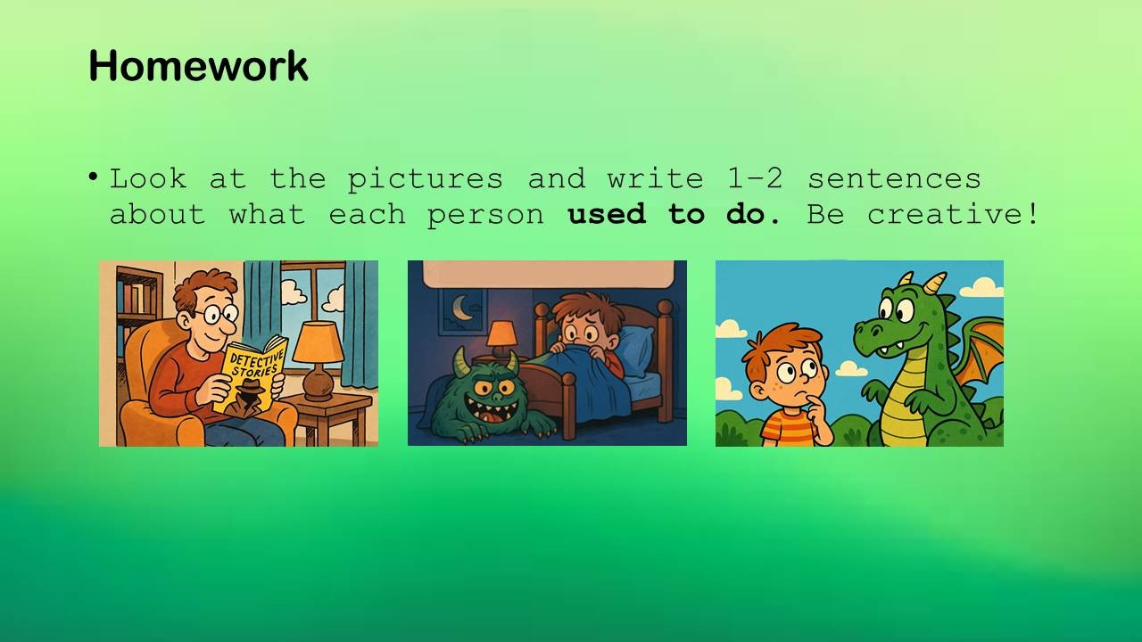 - Задание: написать по 2–3 предложения с used to для каждого персонажа.