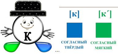 (Находят букву на ленте букв. Буква «КА» обозначает согласный звук, поэтому находится на ленте букв в синем месте; в нижнем ряду, потому что обозначает глухой звук.)