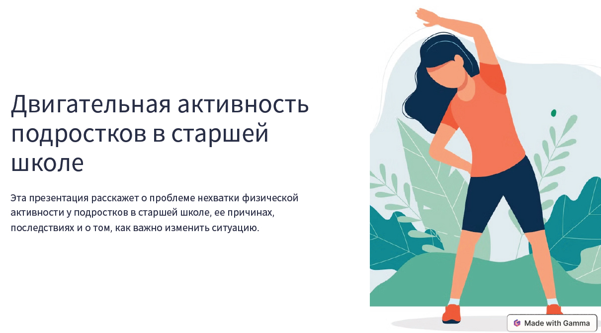 Двигательная активность детей в старшей школе. Исследование Дьяконов Максим Сергеевич, учитель физической культуры Разделы: Спорт в школе и здоровье детей, Внеклассная работа Классы: 9, 10, 11 Ключевые слова: ЗОЖ Работа выполнена в форме презентации 26.12.2024