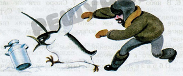 Среди пингвинов есть и драчуны. Однажды один пингвин бежал мимо нашей палатки и налетел на пустой бидон. Бидон звенел. Пингвин обратно вернулся и опять налетел. Бидон звенит. Пингвин с криком на него налетел и бьёт крыльями. Я пингвина оттаскиваю от бидона, а он мне руки клюёт, злится.