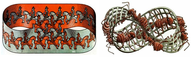 Одним из самых известных художников, работавших с темой ленты Мёбиуса, является Морис Эшер. Его литографии, в которых изображены муравьи, ползущие по поверхности ленты, прекрасно иллюстрируют, как один объект может выглядеть как два, находясь на самом деле на одной поверхности. Эшер использовал геометрию, фракталы и оптические иллюзии в своих работах, что придает им особую многослойность и интригует зрителей.