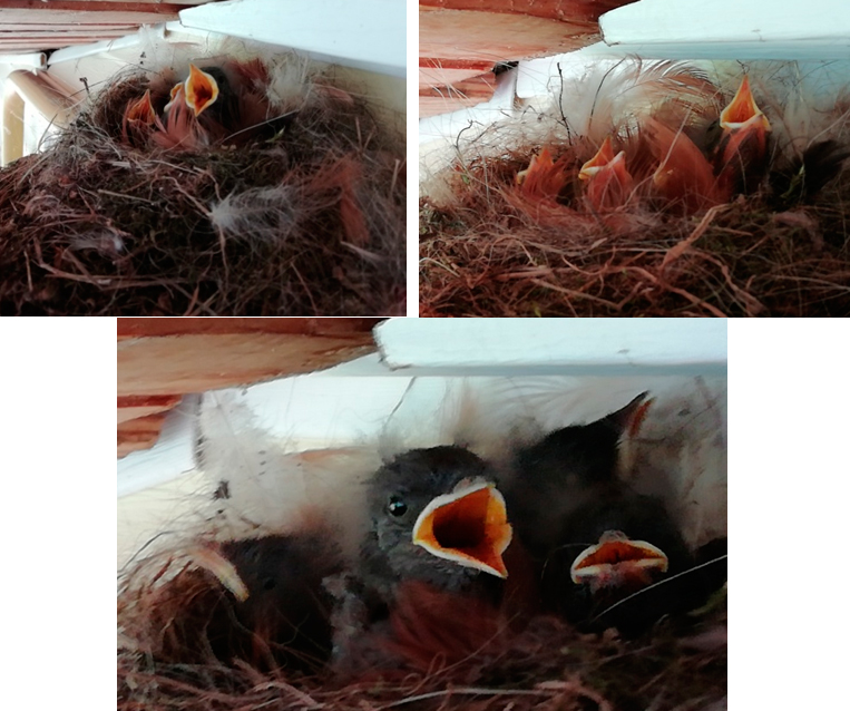 Вылупившиеся птенцы слепые, глухие, неоперившиеся. В холодную погоду самка не покидает гнезда, корм носит самец. Выкармливание выводка длится 14 дней. За это время взрослые птицы приносят тысячи гусениц, мух, личинок.