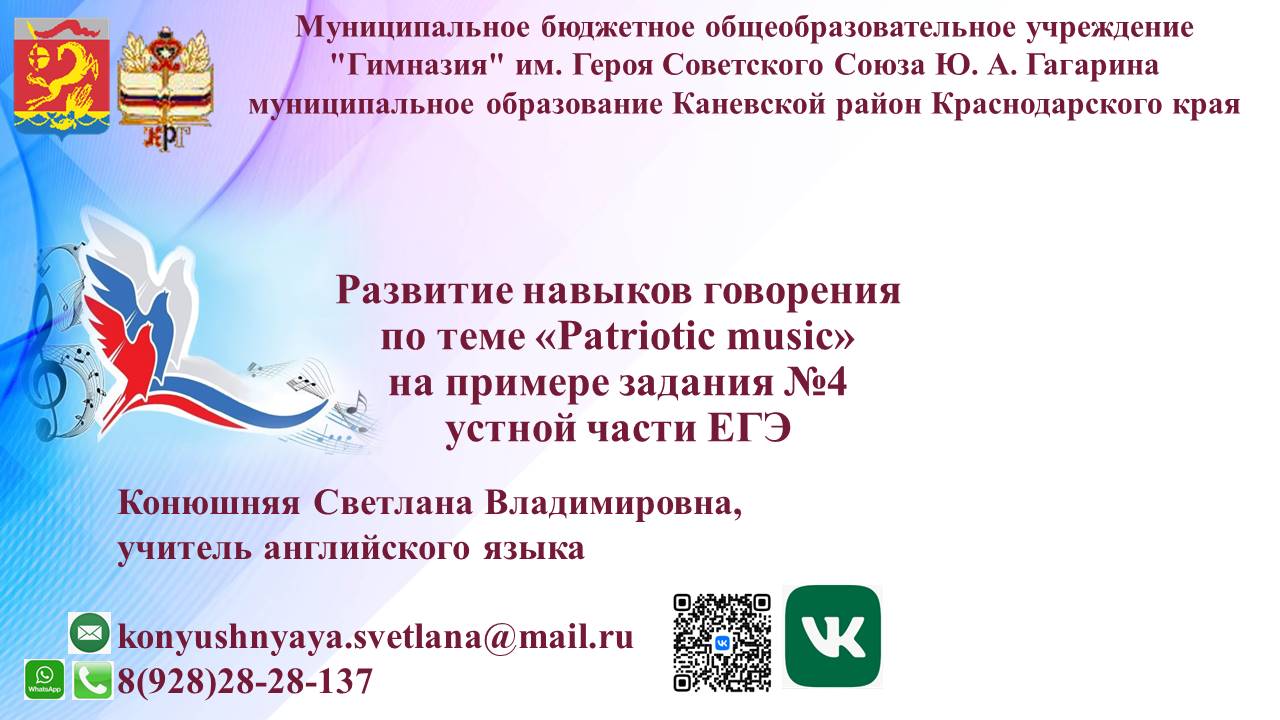 Формирование навыков говорения по теме "Patriotic music" на примере задания 4 устной части ЕГЭ по английскому языку. Урок с применением современных ИКТ технологий Конюшняя Светлана Владимировна, учитель английского языка Разделы: Иностранные языки, Мастер-класс Класс: 11 Ключевые слова: Подготовка к ЕГЭ по английскому языку Работа выполнена в форме презентации 21.01.2025