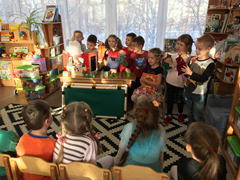 Детям одеваются куклы на руки, все рассаживаются на стульчики и начинается кукольный спектакль (играет музыка).
