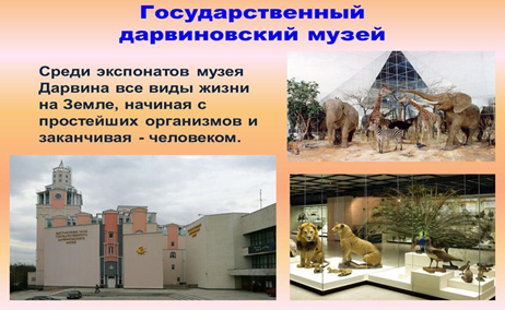 Это интересно. Название музея связано с именем путешественника и ученого Чарльза Дарвина. В старших классах на уроках биологии, зоологии вы подробнее познакомитесь с этим ученым и узнаете, какой вклад он внес в науку. В своих научных трудах он объяснил, почему все живое приспособлено к жизни. (Современные животные – это потомки вымерших, которые постоянно изменялись под влиянием условий внешней среды и приспосабливались к новым условиям жизни, (выживают только те животные, которые сумели лучше приспособиться к окружающим условиям)). Это сложный материал, поэтому об этом ученом, о его вкладе в науку вы подробнее будете знакомиться в старших классах на уроках биологии, зоологии.