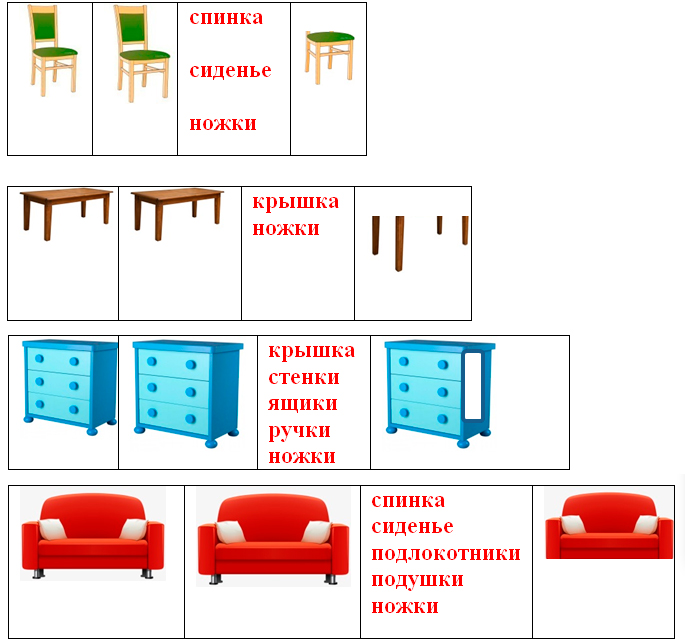Дефектолог. Ребята, хлопните в ладоши, если услышите название частей стула: сиденье, двери, спинка, полки, ножки. Аналогичная работа проводится со столом, диваном, тумбой.