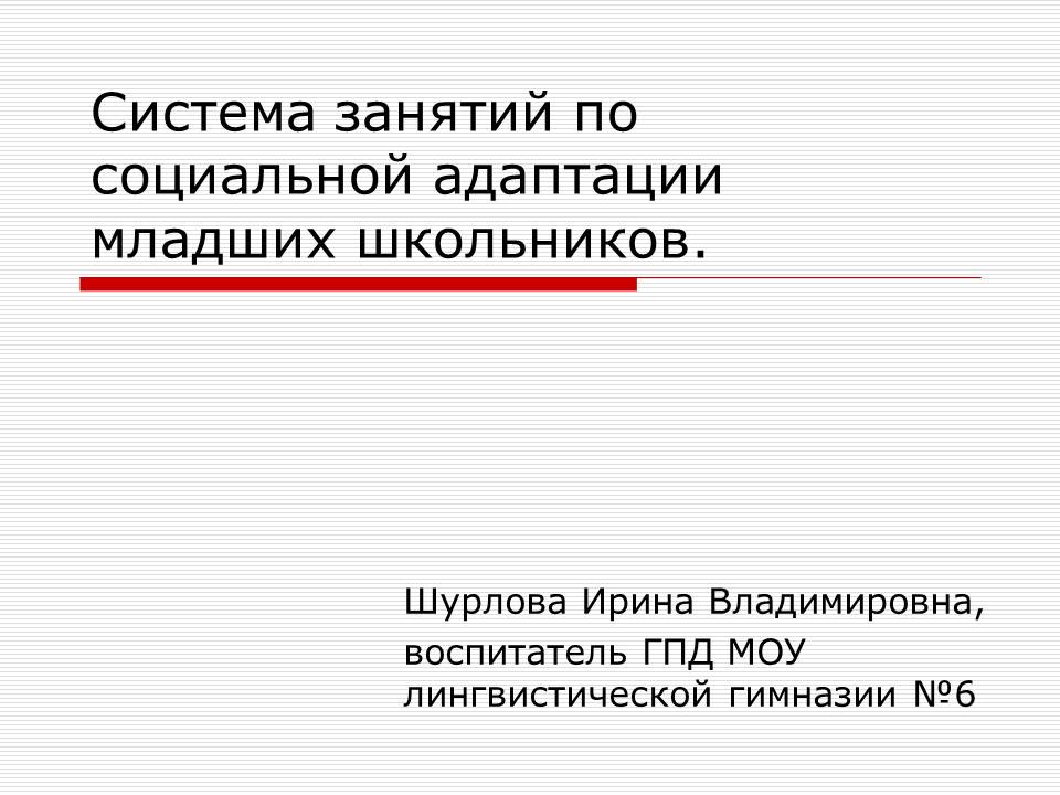 Система занятий по социальной адаптации младших школьников Казакова Ирина Владимировна Разделы: Начальная школа, Классное руководство Классы: 1, 2, 3, 4 Ключевые слова: Социальная адаптация, младшие школьники Работа выполнена в форме презентации 28.01.2025