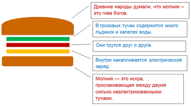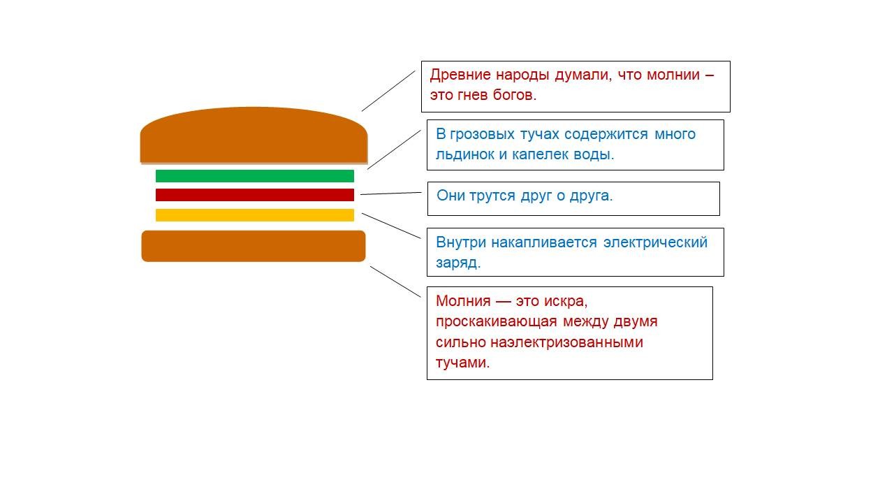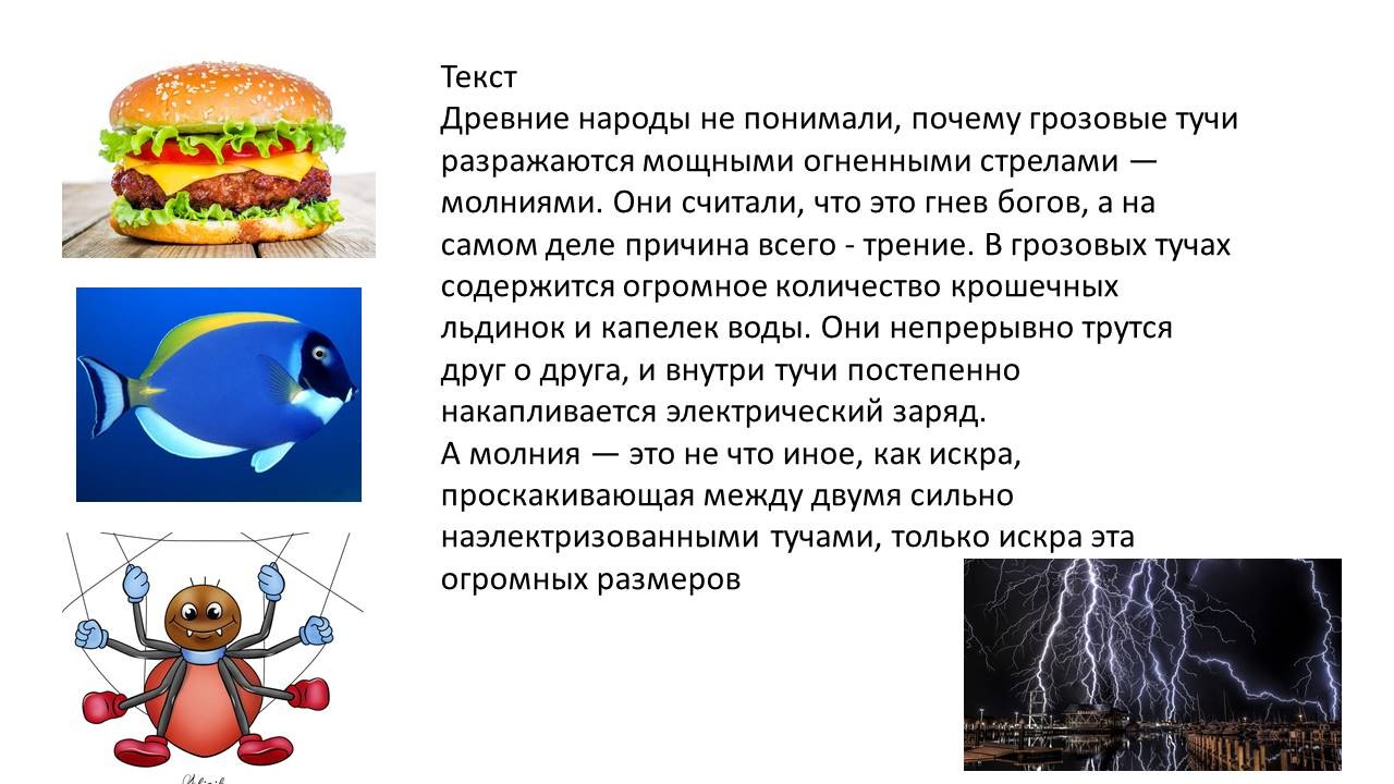Учитель: Конечно, мы с вами тренируемся над пересказом долго, и ключевыми классическими приемами будут те, которые мы записали в самом начале урока. Но мне хотелось бы вам предложить на рассмотрение еще 3 нетрудных, но действенных приема. Чтобы вы их запомнили, я даже попыталась воплотить их названия в игрушки: паук, рыба и гамбургер. Давайте подумаем, как эти предметы (своеобразные органайзеры) нам помогут. ГАМБУРГЕР