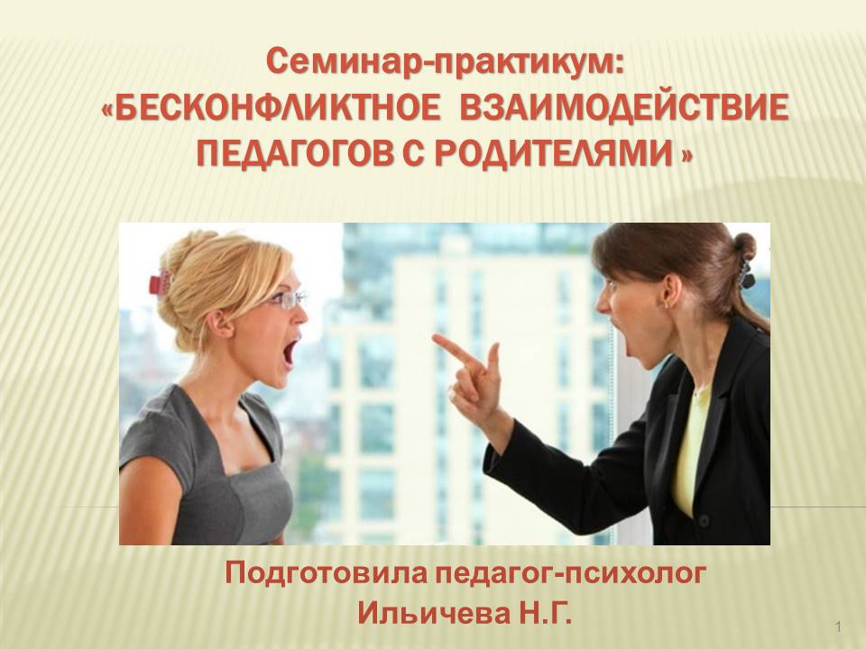 Бесконфликтное взаимодействие педагогов с родителями Ильичева Наталья Геннадьевна, Педагог-психолог Разделы: Работа с родителями Работа выполнена в форме презентации 30.01.2025