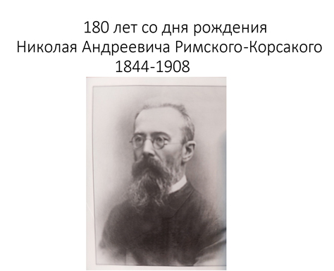 Мероприятие к 180-летию Н.А.Римского-Корсакого Юрчева Елена Леонидовна, преподаватель фортепиано и теории музыки Разделы: Музыка Ключевые слова: Н.А.Римский-Корсаков Работа выполнена в форме презентации 4.02.2025