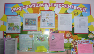 - «Доска объявлений для родителей». С помощью выставленной информации в родительском уголке, родители могут прочитать правильные советы о том, как лучше воспитывать детей и о том, какие занятия и кружки с ними проводятся и другие события в садике. Благодаря уголкам, родители более внимательно относятся к своим детям, следят за их успехами;