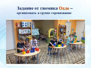 На следующий день к детям пришел гномик Охле со вторым заданием и предложил устроить соревнование. Мы разделили детей на три команды по три человека. Для начала детям предлагалось сделать постройки из объёмного конструктора, у каждой команды на столе было одинаковое количество геометрических фигур. Затем из игр Воскобовича: «Фонарики», «Соты», «Лепестки», «Триузорчик», «Квадрат», детям надо было сделать любые фигуры, например: ракету, домик, кораблик, животное и т.д. Та команда, которая больше сделала фигур, победила. По окончании выполнения задания, гномик Охле дал оранжевую фишку детям, которую они с Забавушкой прикрепили на карте.