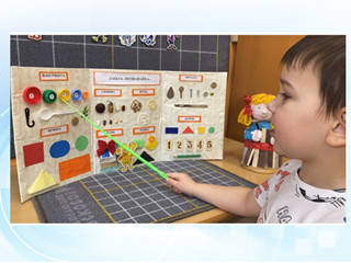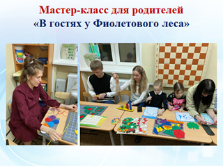 Чтобы привлечь родителей и показать ценность обучения детей математике, мы параллельно с квест-игрой провели для них мастер-класс «В гостях у Фиолетового леса», чтобы познакомить с развивающими играми В.В.Воскобовича.